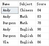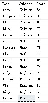 有一張學(xué)生表,分別name,學(xué)科,分?jǐn)?shù) 這三個(gè)字段,如下: