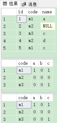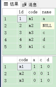 create table #table1 ( id int ,code varchar(10) , name varchar(20) );goinsert into #table1 ( id,code, name ) values ( 1, "m1","a" ), ( 2, "m2",null ), ( 3, "m3", "c" ), ( 4, "m2","d" ), ( 5, "m1","c" );goselect * from #table1;--方法一(推薦)select PVT.code, PVT.a, PVT.b, PVT.c from #table1 pivot(count(id) for name in(a, b, c)) as PVT;--方法二with P as (select * from #table1)select PVT.code, PVT.a, PVT.b, PVT.c from Ppivot(count(id) for name in(a, b, c)) as PVT;drop table #table1;