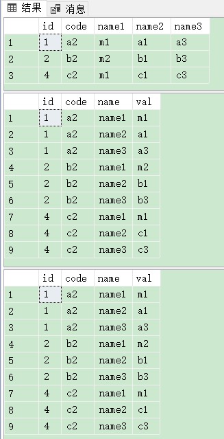 create table #table1 (id int,code varchar(10),name1 varchar(20),name2 varchar(20),name3 varchar(20));goinsert into #table1(id, name1, name2, code, name3)values(1, "m1", "a1", "a2", "a3"), (2, "m2", "b1", "b2", "b3"), (4, "m1", "c1", "c2", "c3");goselect * from #table1;--方法一select PVT.id, PVT.code, PVT.name, PVT.val from #table1 unpivot(val for name in(name1, name2, name3)) as PVT;--方法二with P as (select * from #table1)select PVT.id, PVT.code, PVT.name, PVT.val from P unpivot(val for name in(name1, name2, name3)) as PVT;drop table #table1;