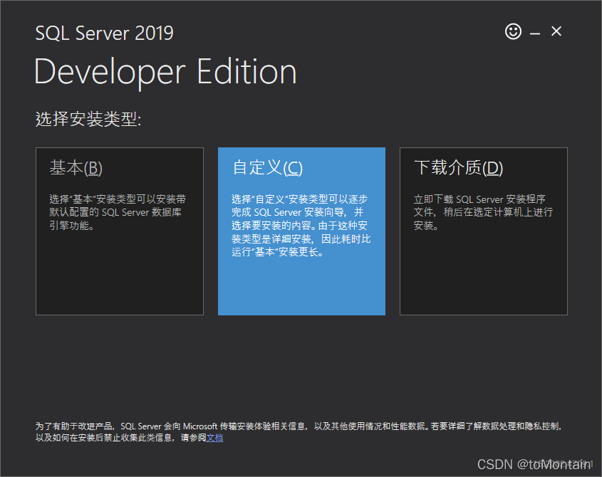 1、官網下載SQL Server 2019 Developer: Developer下載地址 或者點擊這里下載