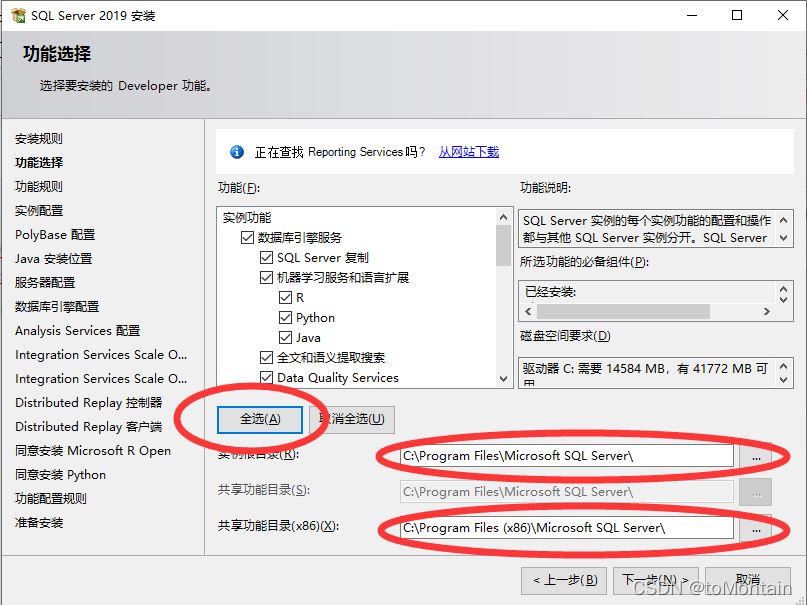 然后選擇需要安裝的功能(通常情況選擇全選按鈕,機器學習服務和語言拓展可不選),選擇安裝路徑(根據自己需求更改即可),完成后點擊下一步: