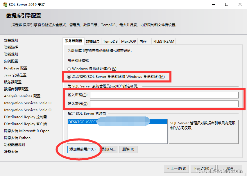 選擇混合模式,點擊添加當前用戶,為超級管理員(sa)設置密碼(記住自己設置的密碼):