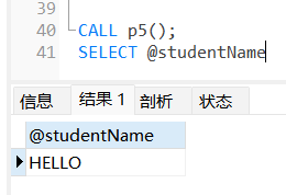 # declare的作用是用來定義變量CREATE PROCEDURE p5()BEGINDECLARE studentName VARCHAR(10); #創建了一個變量set @studentName = "HELLO"; #給變量賦值ENDCALL p5();SELECT @studentName-- 說明了declare定義的變量可以在外部直接調用