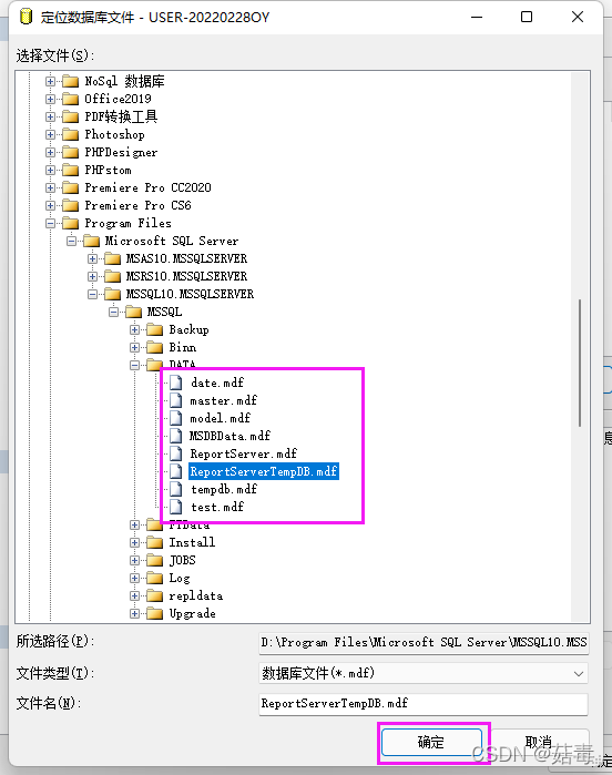 2.附加數據庫對話框中,若要指定要附加的數據庫,可單擊添加,在定位數據庫文件中選擇數據庫所在的磁盤驅動器并展開目錄,以查找并選擇數據的**.mdf** 數據庫文件;