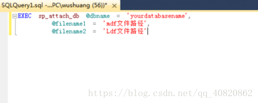 EXEC sp_attach_db @dbname = ‘你的數據庫名",@filename1 = ‘mdf文件路徑(包綴名)",@filename2 = ‘Ldf文件路徑(包綴名)"