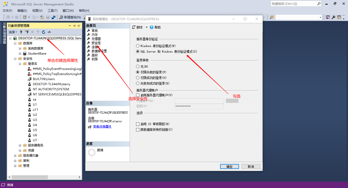 首先再Windows身份登錄下,啟用SQL Server 和 Windows 身份驗證模式