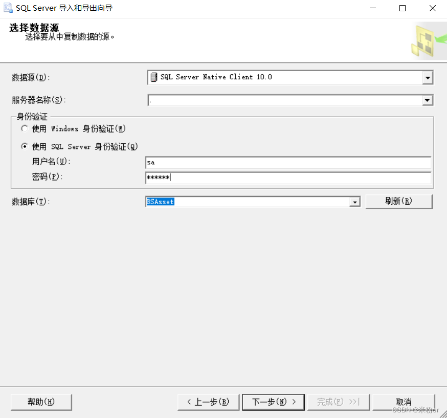 2.在打開的SQL Server導入和導出的向?qū)е?,選擇服務器名稱.代表本機,身份驗證使用SQL Server身份驗證,輸入用戶名,密碼,選擇數(shù)據(jù)庫,單擊下一步
