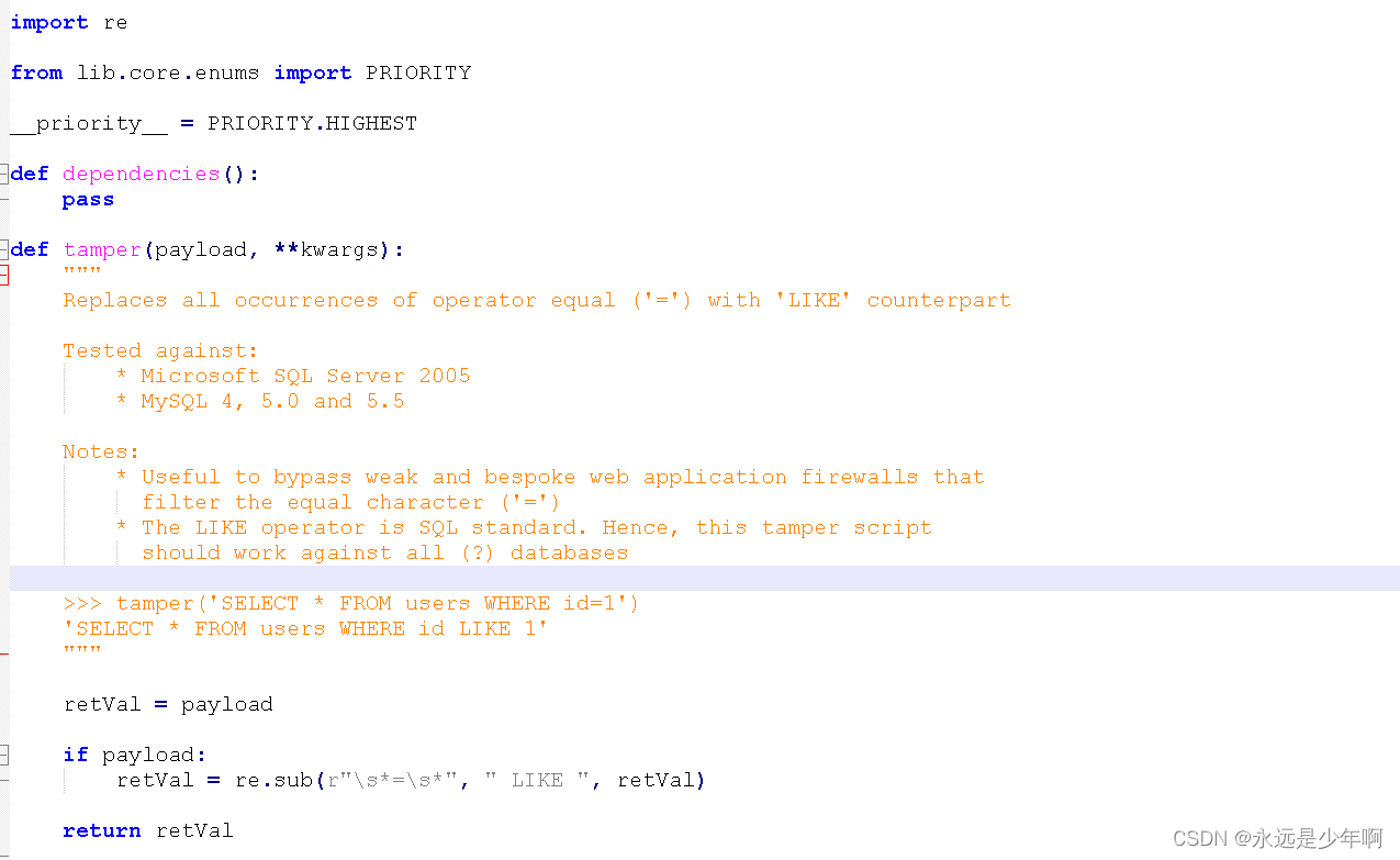 這些python腳本,就是sqlmap的插件,tamper翻譯成中文是過濾的意思,這些腳本,對sqlmap的payload進(jìn)行一定的修改,將其中容易被攔截的關(guān)鍵字等過濾成可以繞過的形式,因此,這些腳本中的內(nèi)容大多是一些替換,其中一個(gè)腳本的內(nèi)容如下所示: