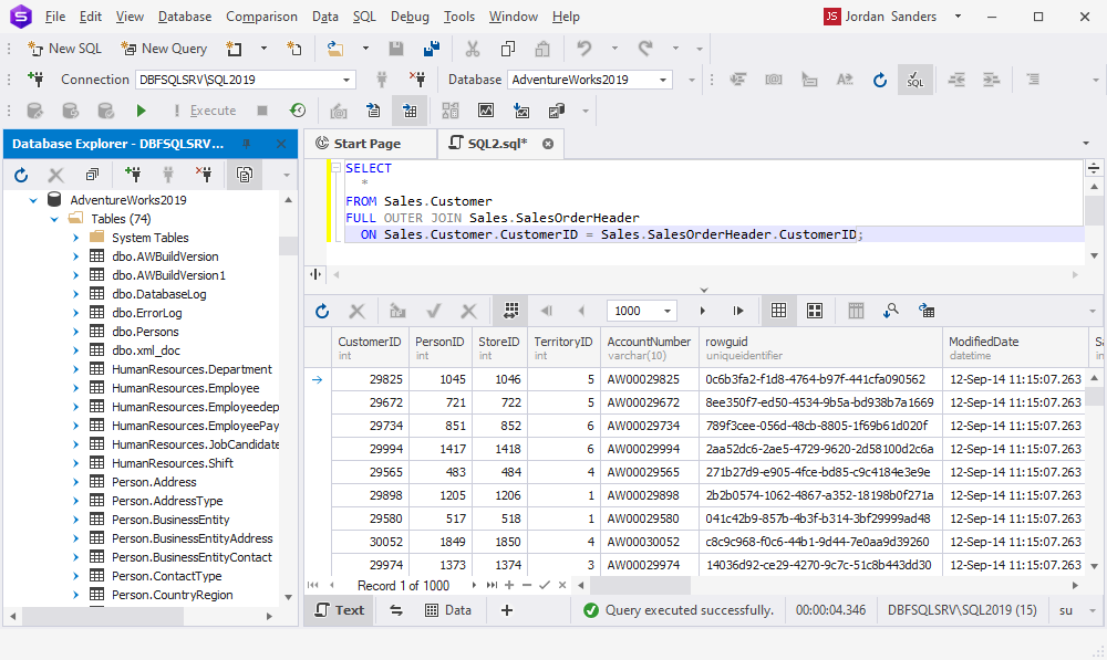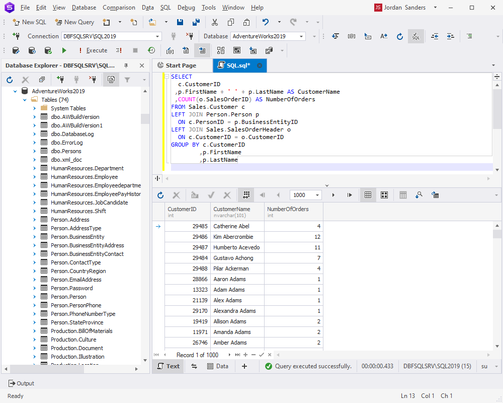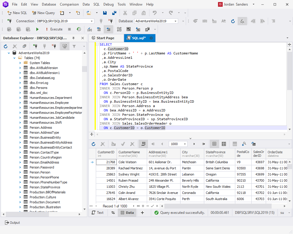- 在 dbForge Studio for SQL Server 中運(yùn)行 SQL JOIN 查詢:創(chuàng)建查詢后,我們將使用 dbForge Studio for SQL Server 對(duì) AdventureWorks2019 數(shù)據(jù)庫(kù)執(zhí)行查詢。這將使我們能夠驗(yàn)證 SQL JOIN 查詢的結(jié)果并確保它返回我們需要的結(jié)果。