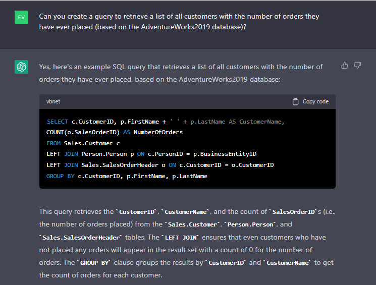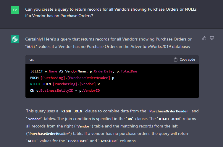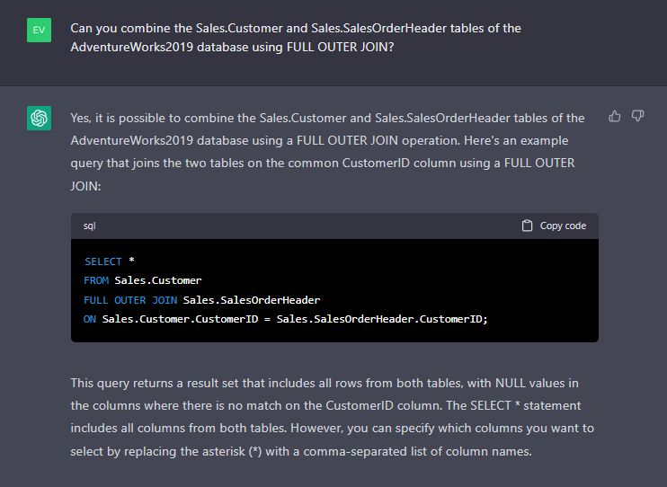 總體而言,ChatGPT 可以通過(guò)為各種與 SQL 相關(guān)的任務(wù)提供快速解答和支持,幫助 SQL 開(kāi)發(fā)人員提高效率和生產(chǎn)力。讓我們看看它如何幫助處理非常復(fù)雜的查詢,例如 JOIN。