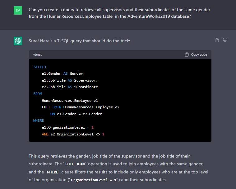因此,要接收 SELF JOIN,我們需要要求 ChatGPT 將一個(gè)表連接到自身,就好像該表是兩個(gè)表一樣。假設(shè)我們要從AdventureWorks2019數(shù)據(jù)庫(kù)的HumanResources.Employee表中獲取所有主管及其下屬的列表,其中主管和下屬的性別相同。