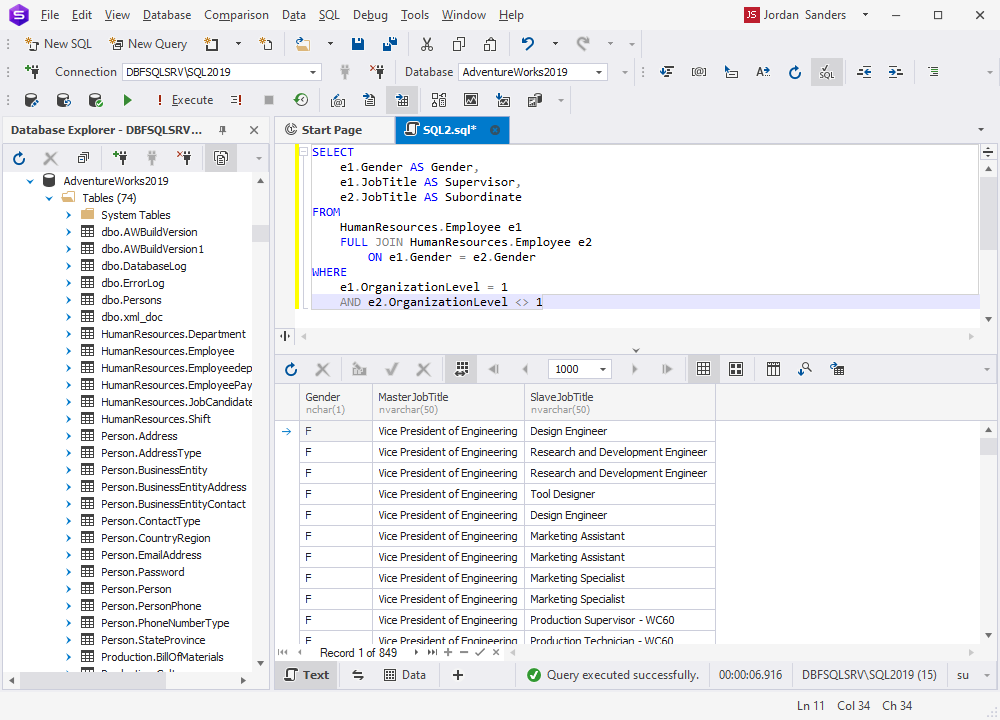 SELECTe1.Gender AS Gender,e1.JobTitle AS Supervisor,e2.JobTitle AS SubordinateFROMHumanResources.Employee e1FULL JOIN HumanResources.Employee e2ON e1.Gender = e2.GenderWHEREe1.OrganizationLevel = 1AND e2.OrganizationLevel <> 1