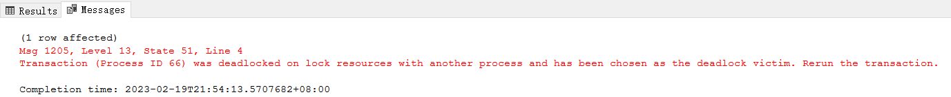 (1 row affected) Msg 1205, Level 13, State 51, Line 5 Transaction (Process ID 62) was deadlocked on lock resources with another process and has been chosen as the deadlock victim. Rerun the transaction.