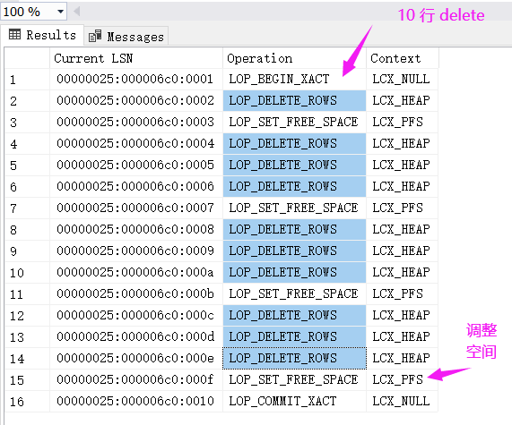 DECLARE @max_lsn VARCHAR(100)SELECT @max_lsn=[Current LSN] FROM fn_dblog(NULL,NULL)DELETE FROM post;SELECT * FROM fn_dblog(NULL,NULL) WHERE [Current LSN] >@max_lsn
