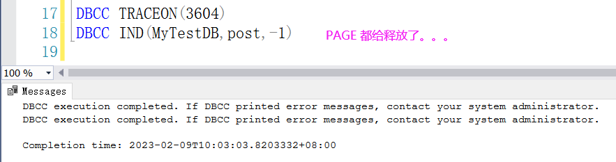 從圖中可以看到,truncate 主要是對 IAM, PFS, GAM 三個空間管理數(shù)據(jù)頁做了修改,并沒有涉及到 PAGE 頁,那就有一個疑問了,我的PAGE頁還在嗎?可以用 DBCC IND 看下。