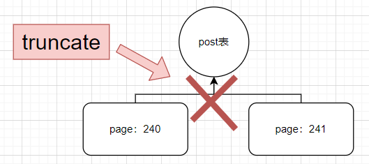 我去,truncate 操作居然把我的 PAGE 頁給弄丟了,它是怎么實(shí)現(xiàn)的呢? 要想找到答案,大家可以想一想, truncate 是一個 DDL 語句,為了快速釋放表數(shù)據(jù),它干脆把 post 和 page 的關(guān)系給切斷了,如果大家有點(diǎn)懵,畫個圖大概就是下面這樣。
