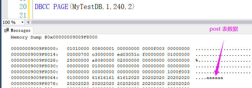 DBCC IND(MyTestDB,post,-1)DBCC PAGE(MyTestDB,1,240,2)