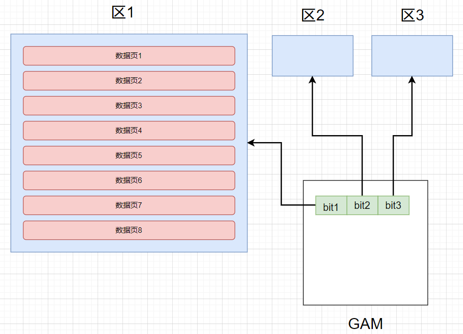 GAM 是用來跟蹤 區(qū)分配 狀態(tài)的數(shù)據(jù)頁,它是用一個 bit 位跟蹤一個 區(qū), 在數(shù)據(jù)庫中一個區(qū)表示 連續(xù)的8個數(shù)據(jù)頁,在 GAM 數(shù)據(jù)頁中,用 1 表示可分配的初始狀態(tài),用 0 表示已分配狀態(tài),可能大家有點(diǎn)懵,我再畫個簡圖吧。