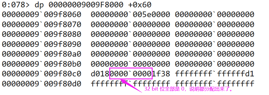 0:078> dp 00000009009F8000 +0x60 00000009`009f8060 00000000`005e0000 00000000`00000000 00000009`009f8070 00000000`00000000 00000000`00000000 00000009`009f8080 00000000`00000000 00000000`00000000 00000009`009f8090 00000000`00000000 00000000`00000000 00000009`009f80a0 00000000`00000000 00000000`00000000 00000009`009f80b0 00000000`00000000 00000000`00000000 00000009`009f80c0 d0180000`00001f38 ffffffff`ffffffd1 00000009`009f80d0 ffffffff`ffffffff ffffffff`ffffffff