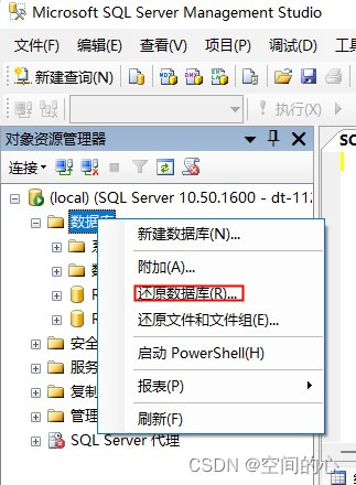 右鍵點(diǎn)擊數(shù)據(jù)庫→還原數(shù)據(jù)庫