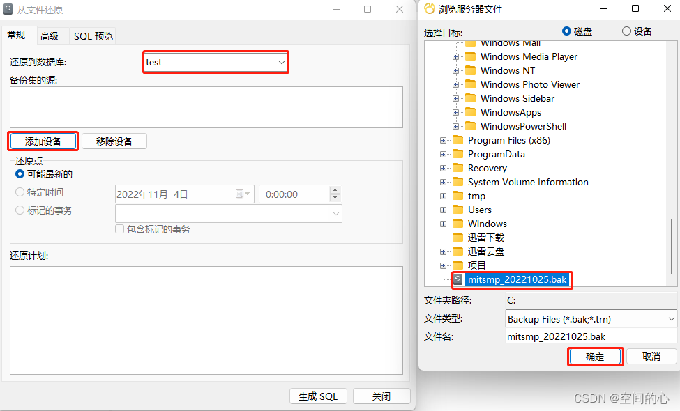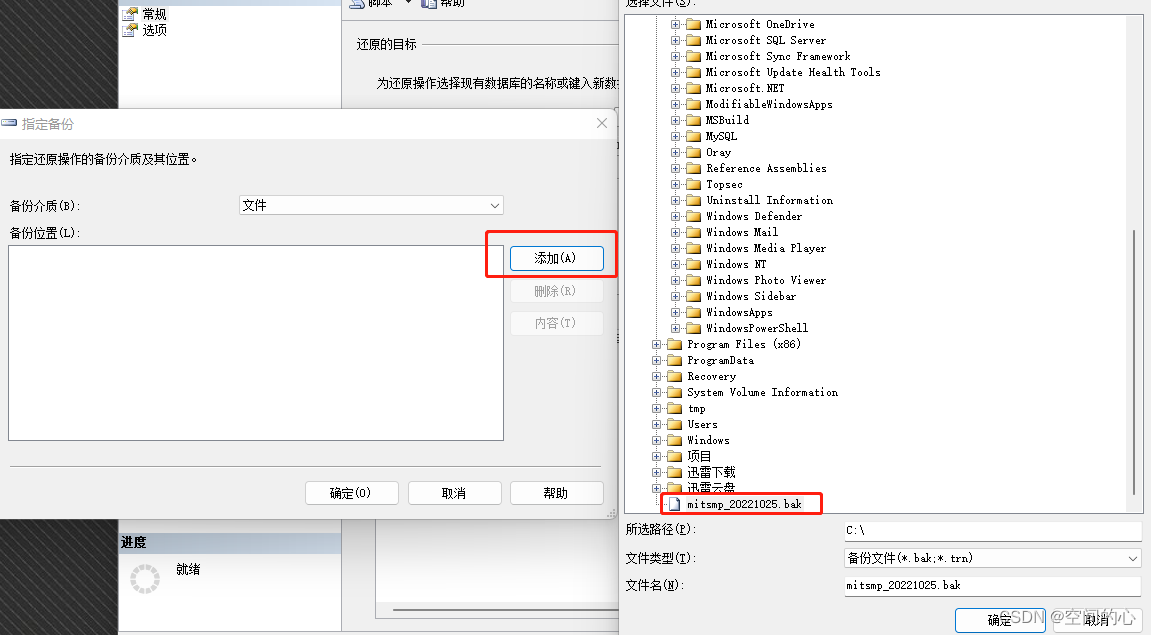 選擇需要還原到的數(shù)據(jù)庫→添加設(shè)備→選擇備份文件→確定