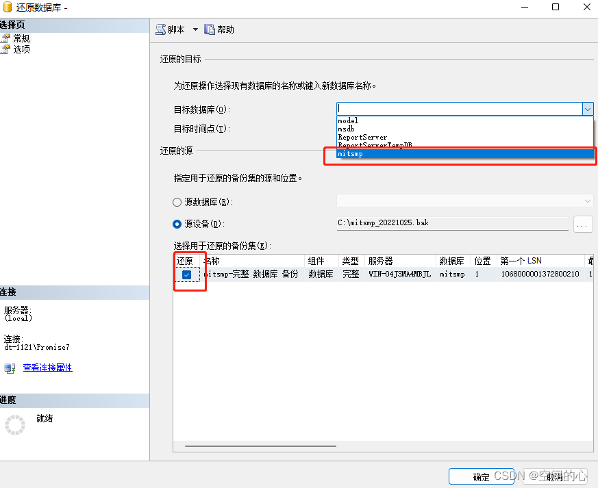 2005版本以上,在還原BAK備份文件時是不需要提前建好數(shù)據(jù)庫的。所以,先選源設(shè)備,再在下拉選項(xiàng)中選擇數(shù)據(jù)庫即可。