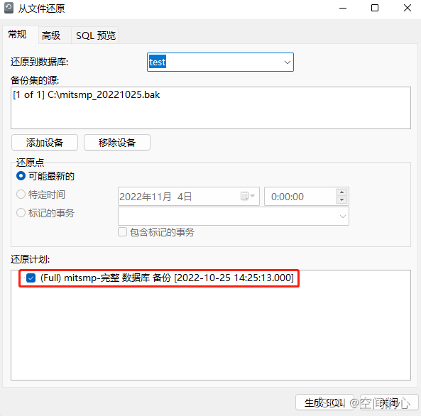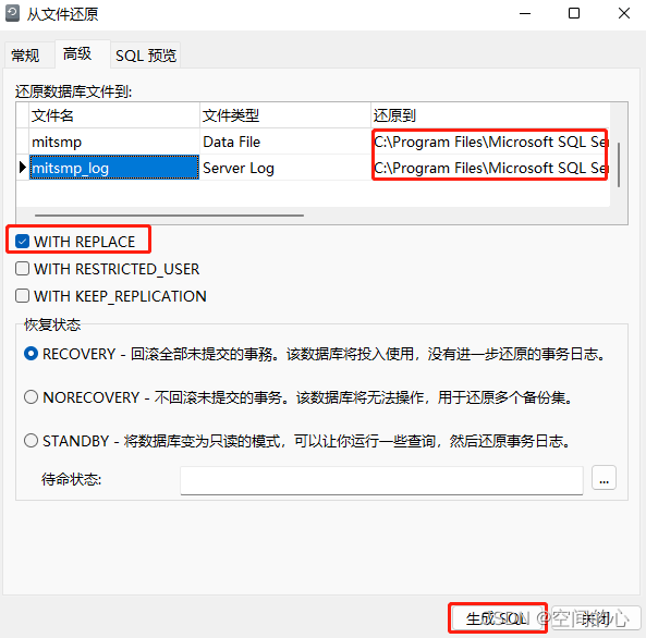 選擇高級→勾選WITH REPLACE→選擇數(shù)據(jù)文件和日志文件存放位置(這里不選擇會默認(rèn)放置在之前服務(wù)器/電腦的地址)→生成SQL