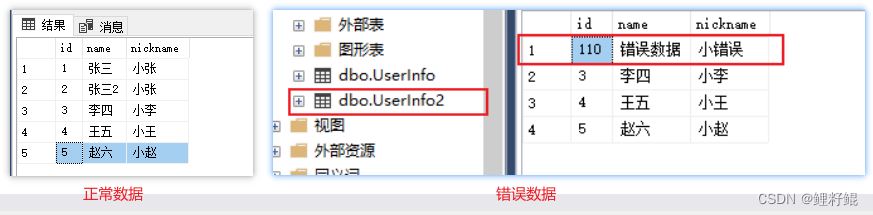 --模擬誤操作 2022-11-23 14.25 開始的誤操作,記一下誤操作事件,以便后續(xù)演示數(shù)據(jù)恢復(fù)--本意刪除張三2的,但是條件不當(dāng),將不該刪除的數(shù)據(jù)也刪除了delete from UserInfo where nickname="小張";insert into UserInfo values (110,"錯(cuò)誤數(shù)據(jù)","小錯(cuò)誤");--不小心新建了一個(gè)表格select * into UserInfo2 from UserInfo;