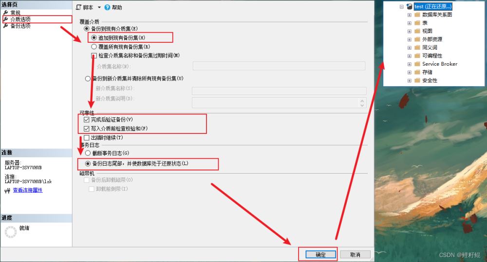 - 【選項(xiàng)】這一項(xiàng)中 選擇【不對(duì)數(shù)據(jù)庫(kù)執(zhí)行任何操作,不回滾未提交的事務(wù)】這一項(xiàng)