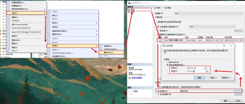 - 12:05 我們發(fā)現(xiàn)自己誤操作了,馬上設(shè)置訪問(wèn)權(quán)限,進(jìn)行事務(wù)日志備份(這很關(guān)鍵),此時(shí)我們就有了2022-10-11所有的完整數(shù)據(jù),以及到2022-10-12 12:05所有的事務(wù)日志。那么我們就可以根據(jù)2022-10-11的完整數(shù)據(jù)以及2022-10-12 12:05 的事務(wù)日志去反推12:00的數(shù)據(jù)。因此我們需要做的第一個(gè)操作先還原2022-10-11的完整數(shù)據(jù)備份,然后還原2022-10-12 12:05事務(wù)日志備份,并且設(shè)置還原的時(shí)間點(diǎn)。最后數(shù)據(jù)庫(kù)系統(tǒng)會(huì)根據(jù)完整數(shù)據(jù)以及事務(wù)日志備份和設(shè)置的還原時(shí)間點(diǎn)去恢復(fù)數(shù)據(jù)。
