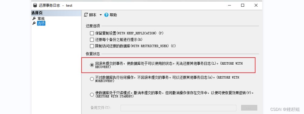 - 設(shè)置完還原的時(shí)間點(diǎn)后,在【選項(xiàng)】這一項(xiàng)設(shè)置中,設(shè)置恢復(fù)狀態(tài)為回滾未提供事務(wù),使用數(shù)據(jù)庫(kù)處于可以使用的狀態(tài)