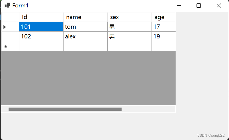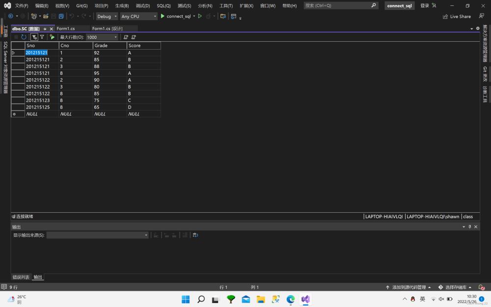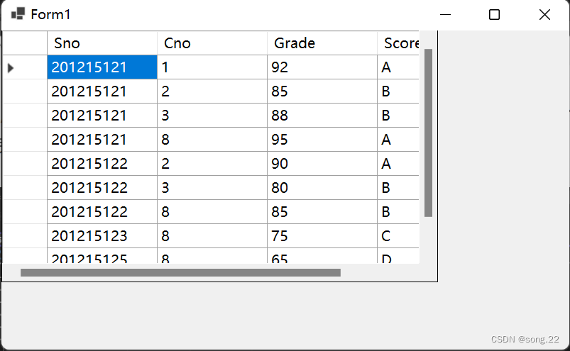 using System.Data;using System.Data.SqlClient;namespace connect_sql{ public partial class Form1 : Form {public Form1(){ InitializeComponent(); Table();} //數據寫入,公共的,所有有表格的地方都用的上 public void Table() { SqlConnection sqlcon = new SqlConnection(); sqlcon.ConnectionString = "Data Source=LAPTOP-HIAIVLQI;Initial Catalog=class;Integrated Security=True"; sqlcon.Open(); dataGridView1.Rows.Clear(); string sql = "select * from sc"; SqlCommand com = new SqlCommand(sql, sqlcon); SqlDataAdapter ada = new SqlDataAdapter(sql, sqlcon);//建立SQL語句與數據庫的連接 DataSet ds = new DataSet(); //實例化Datatable類 ada.Fill(ds); //添加SQL并且執行 dataGridView1.DataSource = ds.Tables[0].DefaultView;//顯示數據 } }}運行程序,Form1窗體中已通過dataGridView顯示數據,且數據與源數據無誤。