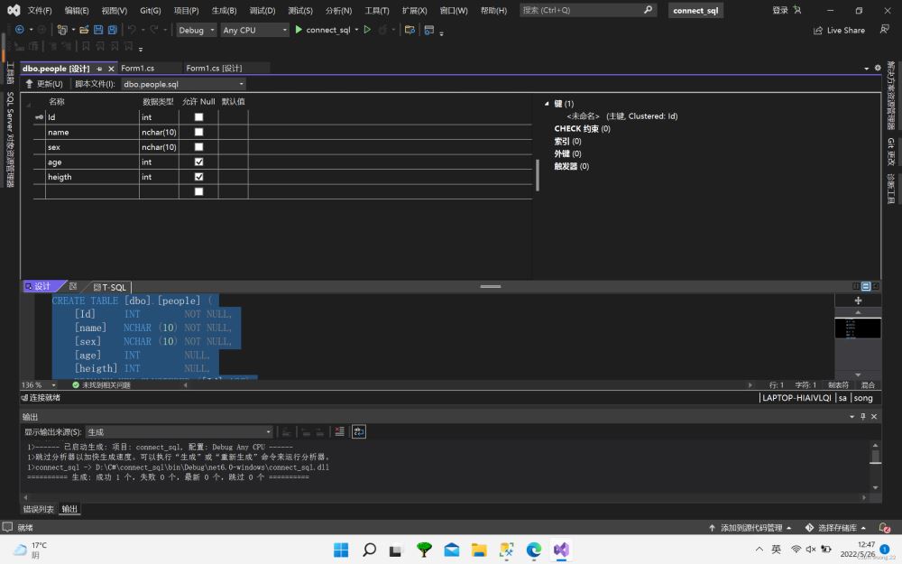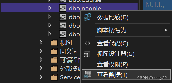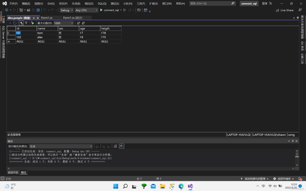 public void Table() { SqlConnection sqlcon = new SqlConnection(); sqlcon.ConnectionString = "Data Source=LAPTOP-HIAIVLQI;Initial Catalog=song;Integrated Security=True";//連接服務器 sqlcon.Open(); dataGridView1.Rows.Clear(); string sql = "select * from people";//SQL語句,可自己編寫需要的。 SqlCommand com = new SqlCommand(sql, sqlcon); SqlDataAdapter ada = new SqlDataAdapter(sql, sqlcon);//建立SQL語句與數據庫的連接 DataSet ds = new DataSet(); //實例化Datatable類 ada.Fill(ds); //添加SQL并且執行 dataGridView1.DataSource = ds.Tables[0].DefaultView;//顯示數據 }那么以上就是VS連接SQL Server 數據庫一些基本操作。