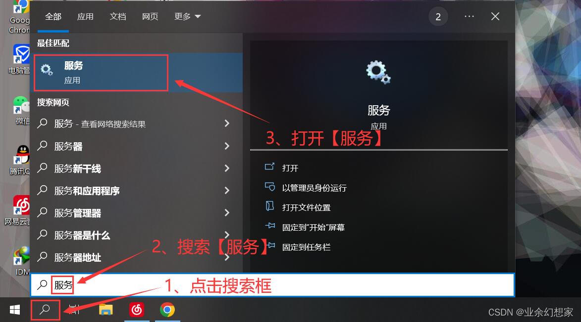 首先要把 SQL Server 的服務(wù)都關(guān)掉,通過 Windows 最下面搜索框搜索 【服務(wù)】 并打開(或者同時(shí)按住 Win + R 鍵,在彈出的運(yùn)行框里面輸入【services.msc】命令也可以進(jìn)入到【服務(wù)】)