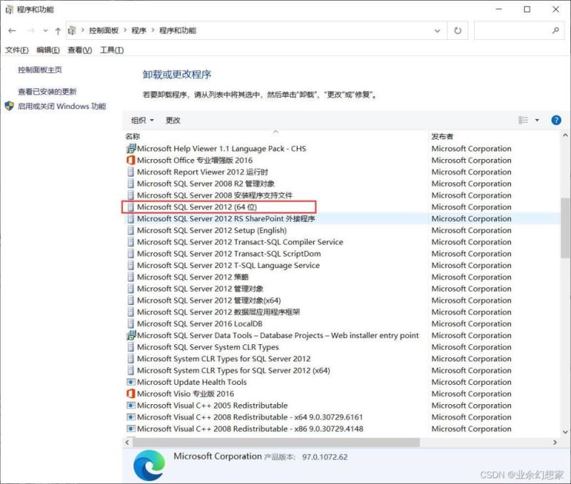 先找到 Microsoft SQL Server 2012(64-bit) 鼠標(biāo)【右鍵】-【卸載/更改】(其他版本找到對應(yīng)的 (64位) 程序,如:SQL Server 2019 就找 Microsoft SQL Server 2019(64-bit))