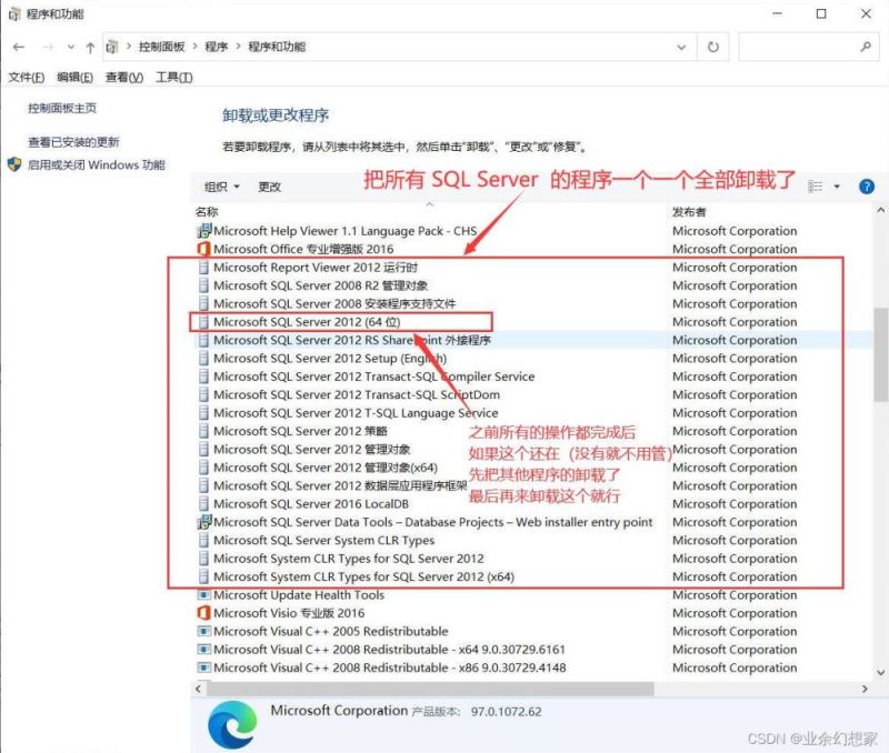 注:每個(gè)人的可能會有不同,順著列表看一下,只要是帶有 SQL Server 的都要?jiǎng)h除掉