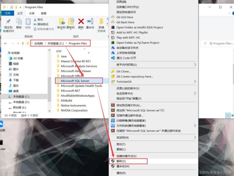找到自己的之前安裝 Microsoft SQL Server 的目錄(默認(rèn)安裝的在 C 盤)鼠標(biāo)【右鍵】-【刪除】,然后進(jìn)入C:\Program Files 文件夾下,找到 Microsoft SQL Server 文件夾 鼠標(biāo)【右鍵】-【刪除】