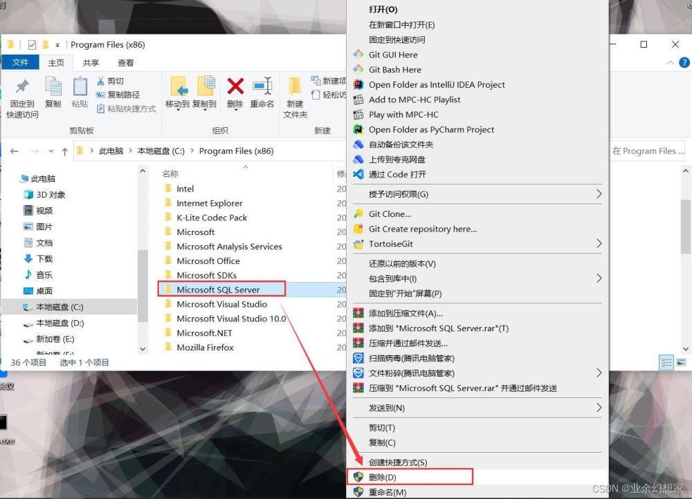進(jìn)入 C:\Program Files (x86) 文件夾下,找到 Microsoft SQL Server 文件夾,鼠標(biāo)【右鍵】-【刪除】