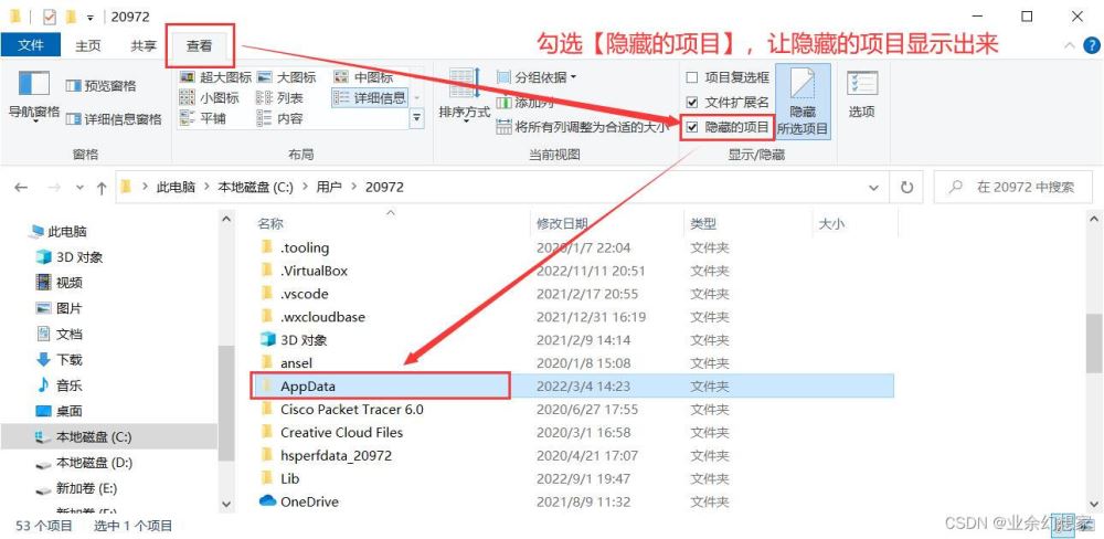 注:因?yàn)?AppData 是一個(gè)隱藏的文件,所以需要顯示隱藏的項(xiàng)目,就按照下面的操作就可以找到了