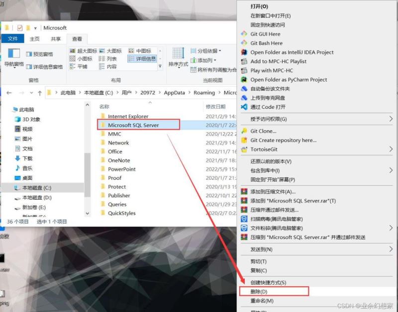 進(jìn)入 C:\Users\20972\AppData\Roaming\Microsoft 文件夾下(就是 C:\用戶\你自己電腦的用戶名\AppData\Roaming\Microsoft,這里我的用戶名叫20972),找到 Microsoft SQL Server 文件夾 鼠標(biāo)【右鍵】-【刪除】