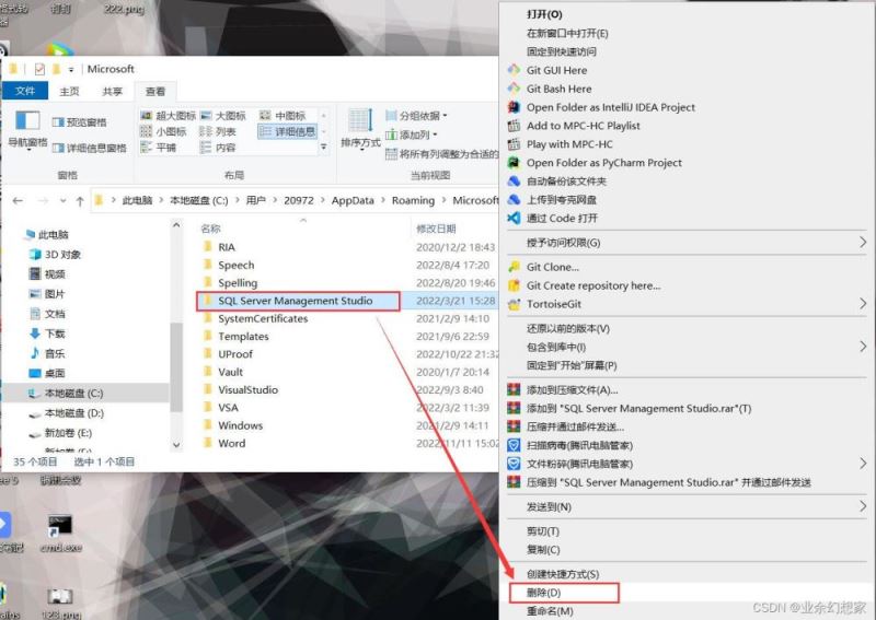 在 C:\Users\20972\AppData\Roaming\Microsoft 文件夾下(就是剛剛這個(gè)文件夾下),找到 SQL Server Management Studio 文件夾 鼠標(biāo)【右鍵】-【刪除】