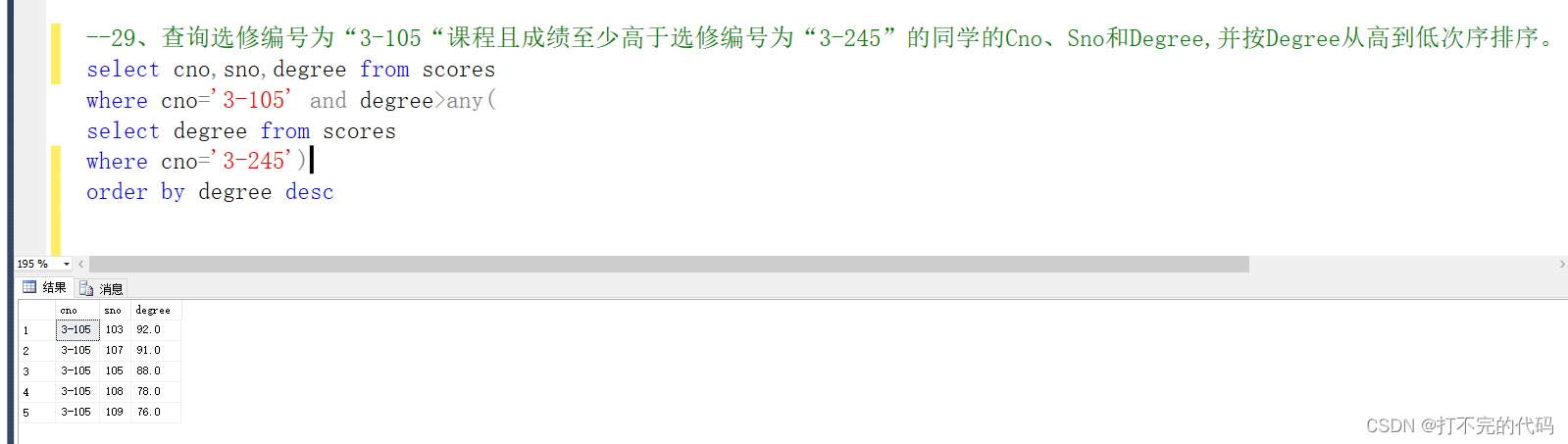 示例:--29、查詢選修編號為“3-105“課程且成績至少高于選修編號為“3-245”的同學的Cno、Sno和Degree,并按Degree從高到低次序排序。