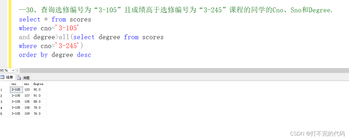 示例:--30、查詢選修編號為“3-105”課程且成績高于選修編號為“3-245”課程的同學的Cno、Sno,Degree.
