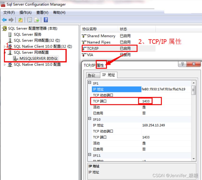 于是在網站上搜索解決方案,基本上都是說在 SQLServer的管理配置界面設置一下,TCP/IP的端口即可。也的確如此;但是我配置完端口之后,依舊無法正常連接。