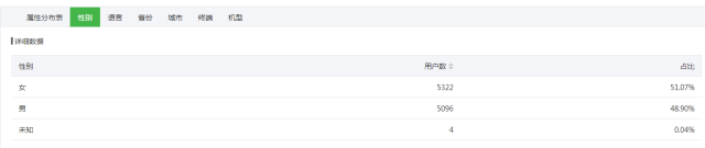 特別關(guān)注一下用戶屬性,在這里可以查看用戶的性別比例、語言分布等。