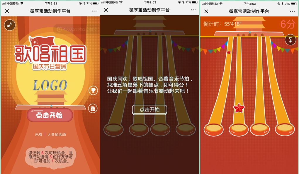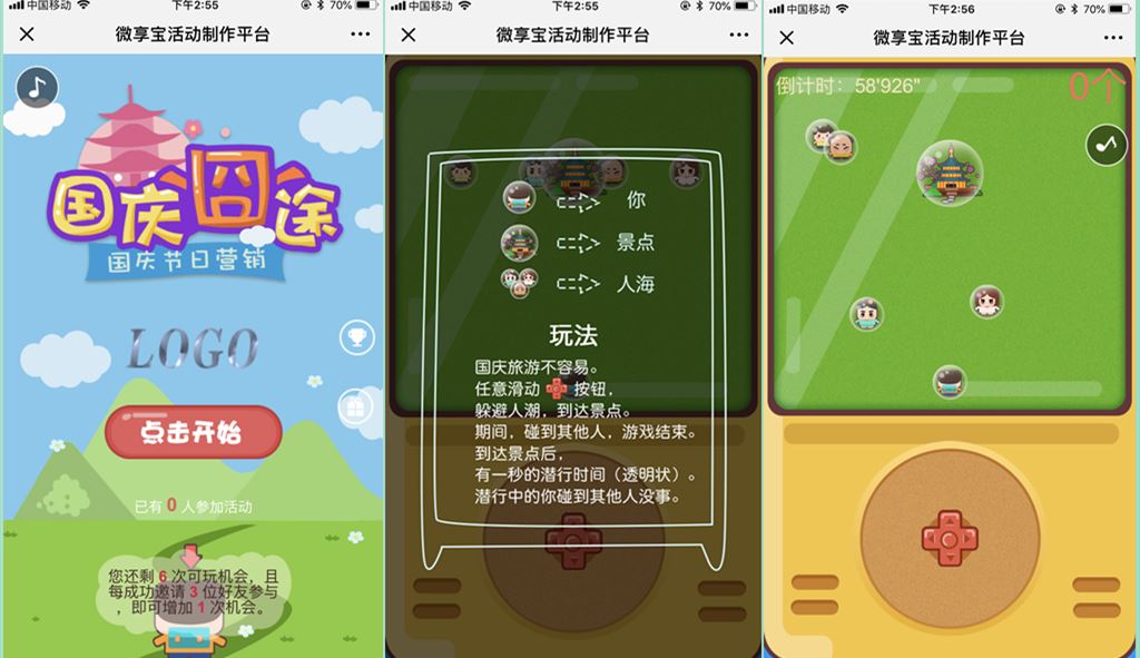 首先用的比較多的是國慶節微信游戲,該應用不僅貼合國慶旅游熱點,極易引起粉絲的關注和參與,而且活動自帶傳播屬性,更易在朋友圈引起爆炸式傳播效應。交互佳、體驗好,趣味性強、吸粉傳播不在話下,支持全面自定義,而且在玩耍的過程中,粉絲還能時不時地邂逅 “驚喜”——過程奪寶,以及在游戲結束后若成績達標,還能參與隨機抽獎。多重驚喜,讓粉絲的互動積極性更高.