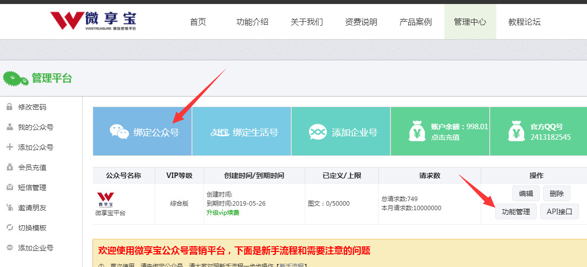 第一步:先把微信公眾平臺綁定到微享寶第三方平臺,可以選擇掃碼授權(quán)或者是配置API接口,二選一即可。上方綁定公眾號就是掃碼授權(quán)的方式接入,左側(cè)添加公眾號按鈕就是手動配置API的方式接入,綁定完成以后,點(diǎn)擊功能管理進(jìn)入后臺.