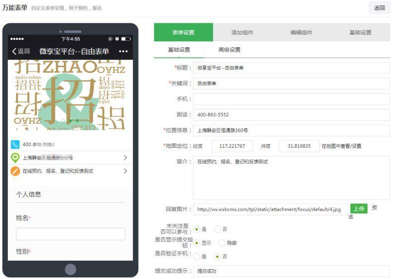 第二步:在微互動中找到萬能表單功能,微信報(bào)名表也叫做微預(yù)約,點(diǎn)添加表單,先編輯表單設(shè)置,基礎(chǔ)設(shè)置部分,填寫微信報(bào)名表的標(biāo)題、關(guān)鍵詞還有聯(lián)系方式、填寫商家的位置信息,微信報(bào)名表可以設(shè)置需要支付費(fèi)用,表單設(shè)置的高級設(shè)置部分,主要是勾選微信報(bào)名表的時(shí)間還有提交報(bào)名的次數(shù)