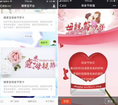 在母親節來臨之前,準備一款感人的微信賀卡,能給節假日增添很多氣氛,每到節日都是公眾號里邊最熱鬧的時候,各個公眾號的商家都紛紛推出自己準備好的母親節微信活動,制作微信活動需要使用到微享寶平臺提供的微信營銷功能,小編拿微信賀卡活動來做例子,講講如何制作母親節的微信公眾號賀卡活動,微信賀卡圖文詳解.
