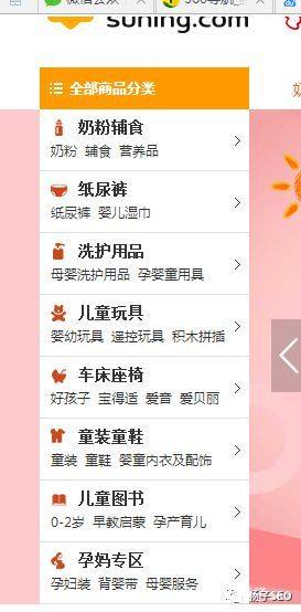 左側(cè)導(dǎo)航,一般是為了彌補(bǔ)頂部導(dǎo)航而存在的,因?yàn)榫W(wǎng)站的每個(gè)欄目下面都會(huì)有很多詳細(xì)的分類,這些分類不可能全部放置在頂部導(dǎo)航中,因此,需要采用左側(cè)導(dǎo)航來進(jìn)行彌補(bǔ)。如下圖為蘇寧電商的左側(cè)導(dǎo)航: